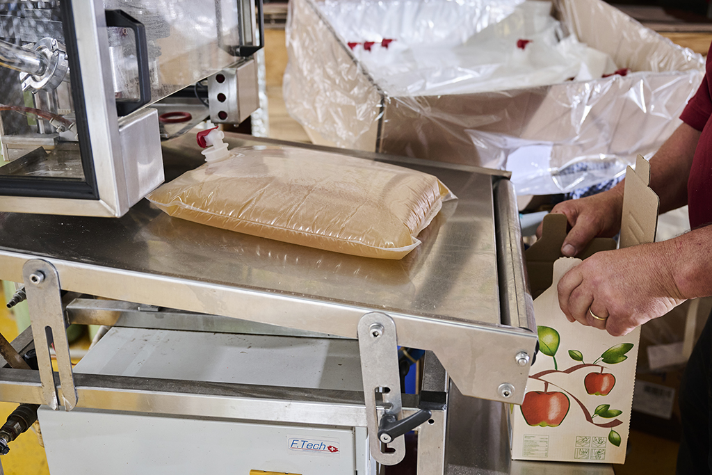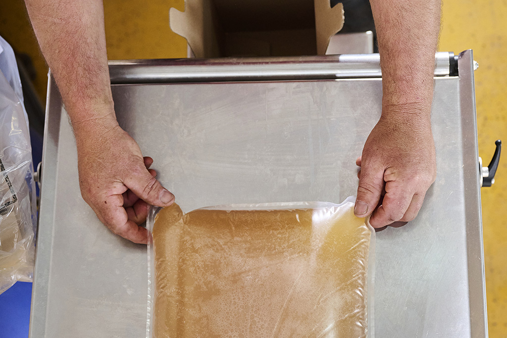… Ensuite, on procéde à la récupération du jus en bac tampon, mise en cuve de clarification, pasteurisation tubulaire et remplissage dans des poches de façon semi-automatique …